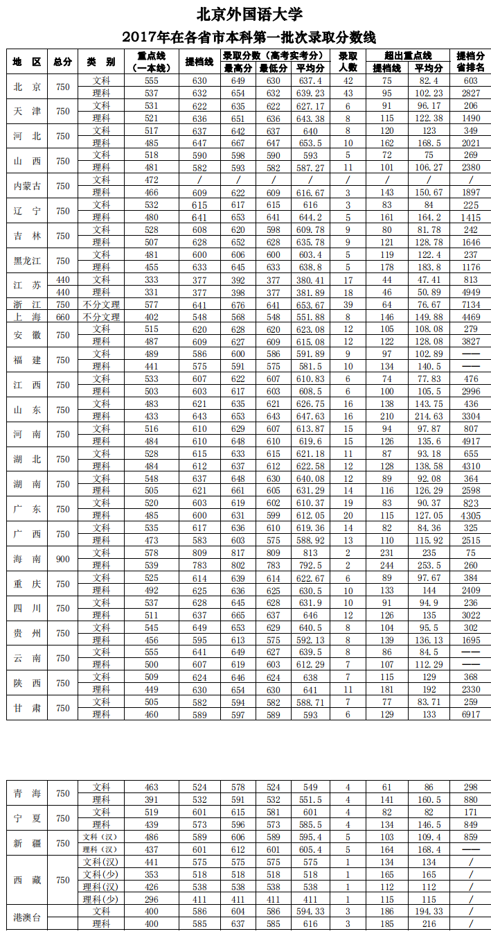 2017北京外国语大学在各省市本科第一批次录取分数线