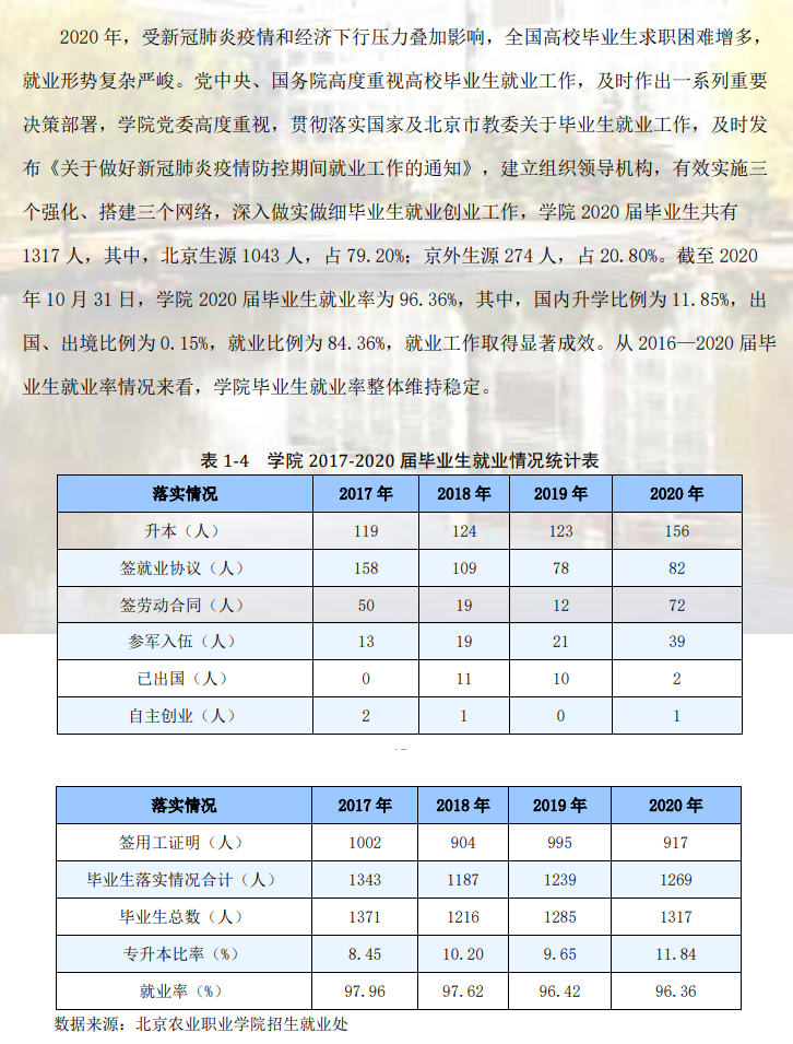 北京农业职业学院2020届毕业生就业率为96.36%;2019届毕业生就业率为96.42%;2020届毕业生就业率为97.62%
