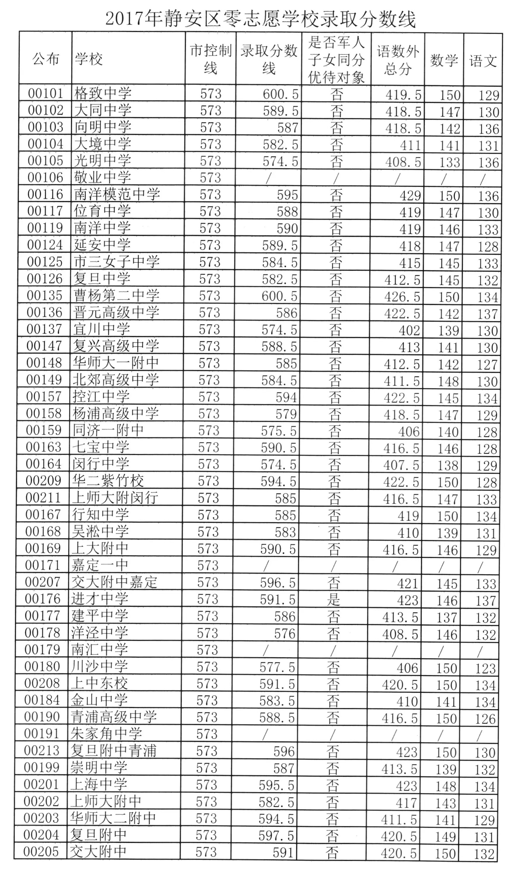 2017上海市静安区中考零志愿、名额分配录取分数线