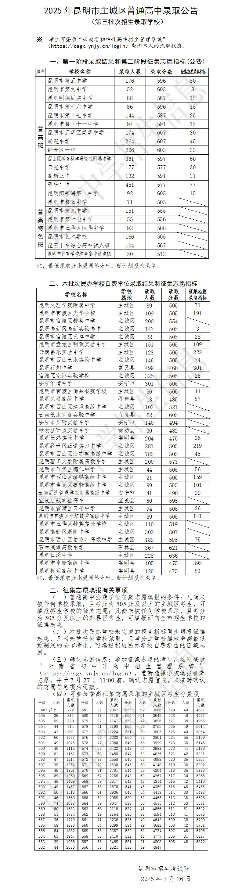2025年昆明市主城区普通高中录取分数线(第三批次招生录取学校)