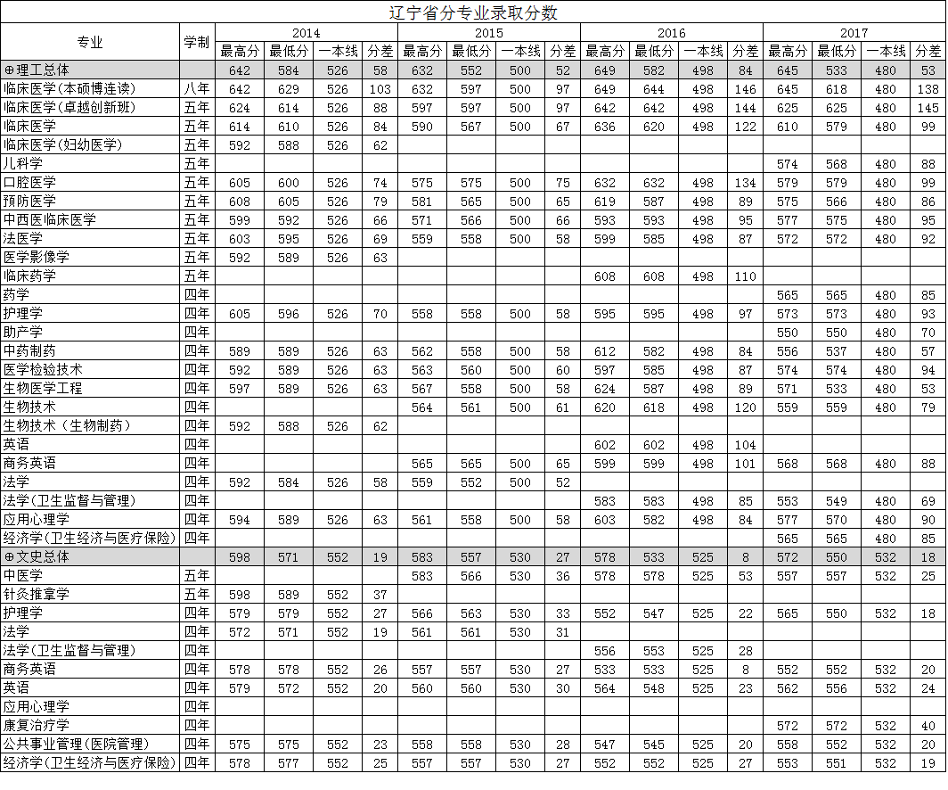 南方医科大学2014、2015、2016、2017年在辽宁分专业录取分数线情况