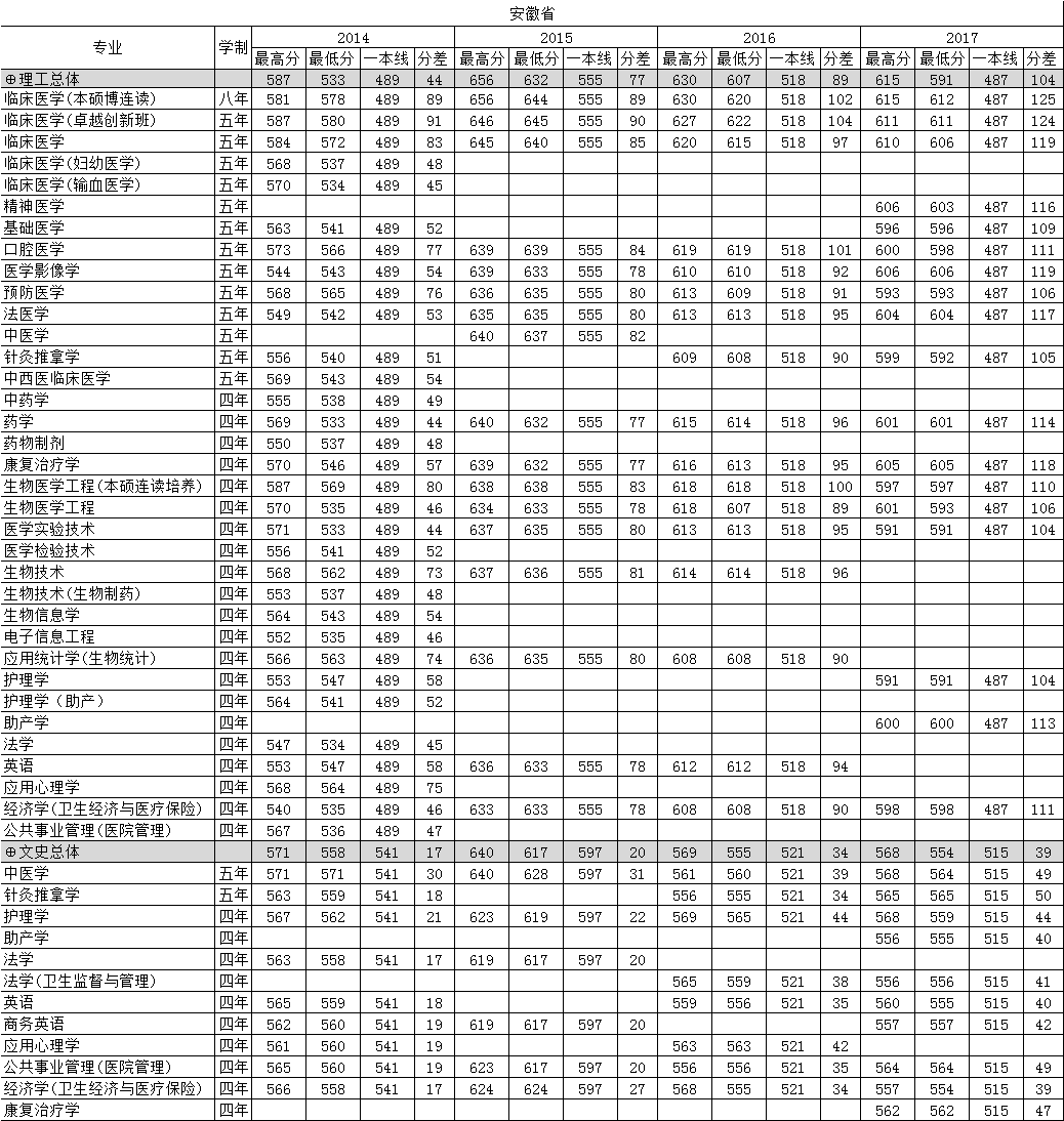 南方医科大学2014-2017年高考在安徽省分专业录取分数线情况