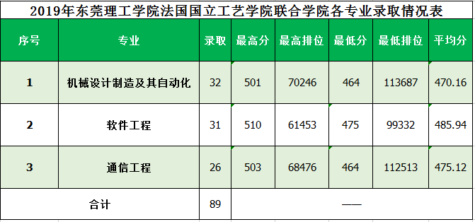 2019年东莞理工学院法国国立工艺学院联合学院 (中外合作办学)各专业录取分数表