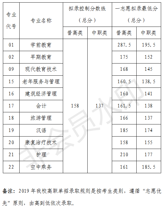 川北幼儿师范高等专科学校2019年高职单招拟录控制线
