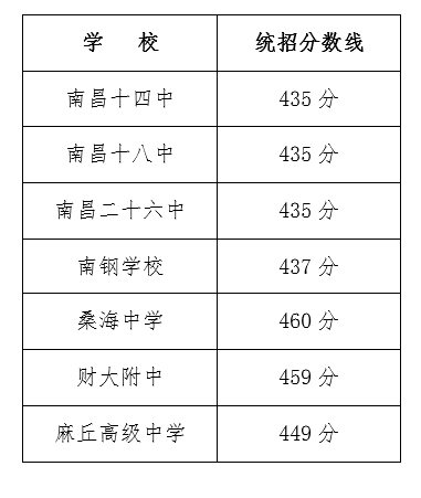 2017年南昌市第四批次一般普通高中统招最低录取分数线划定为435分。各校统招投档分数线分别为: