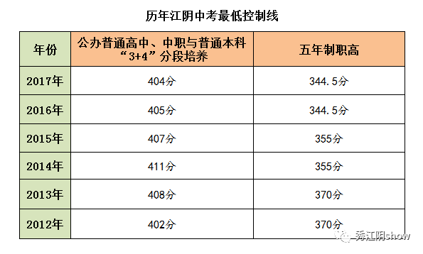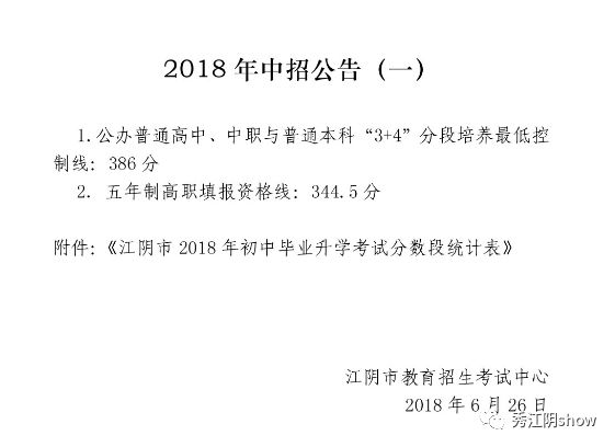 | 今天下午,2018年江阴中考成绩正式公布!考生和家长们最关心的普通高中招生最低控制线也随之公布了! 2018江阴中考最低控制分数线 公办普通高中,中职与普通本科“3+4”分段培养 最低控制线:386分 五年制高职 最低控制线:344.5分