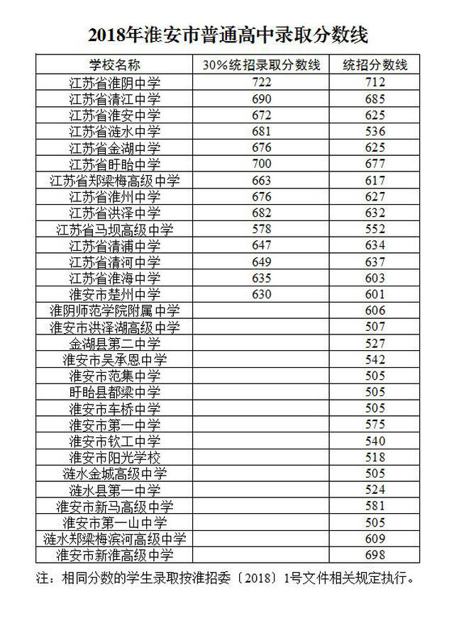 2018年淮安市普通高中录取分数线