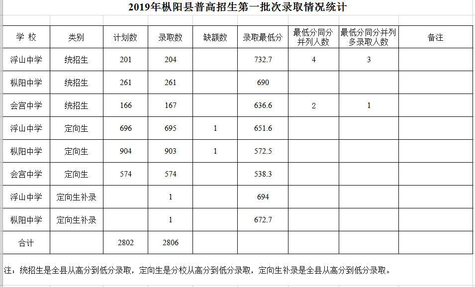 注:统招生是全县从高分到低分录取,定向生是分校从高分到低分录取,定向生补录是全县从高分到低分录取。