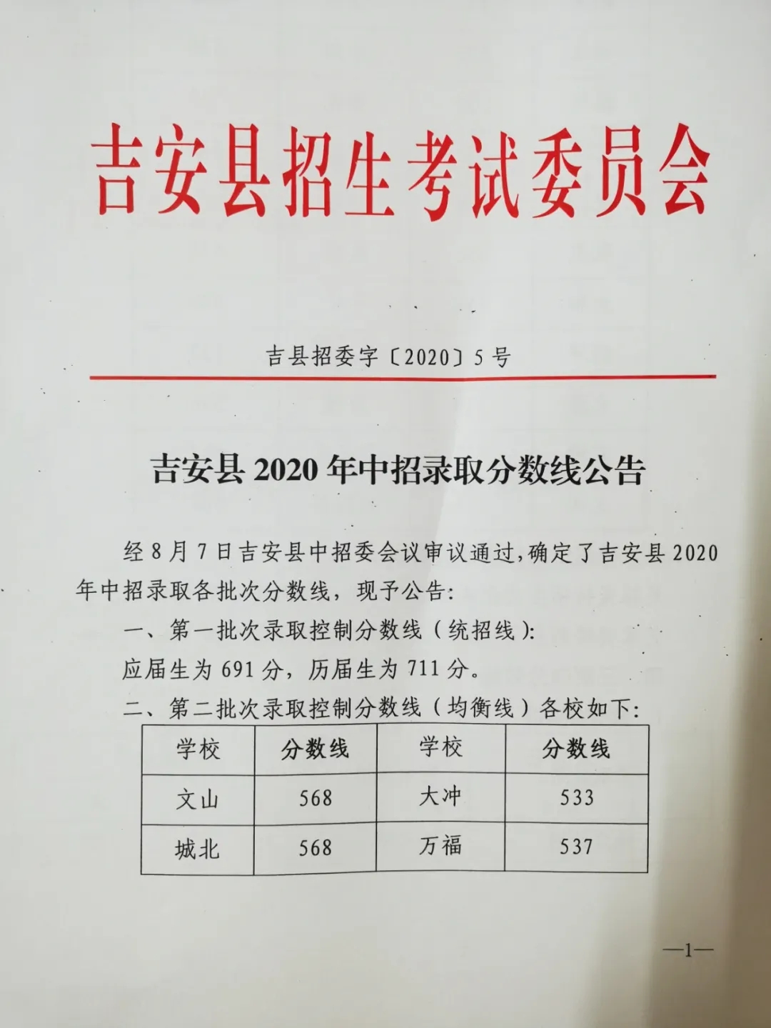 8月7日下午,吉安县招生考试委员会发布了《2020年中招录取分数线公告》,公告明确了吉安县公办高中统招线为691分,均衡最低分数线为530分。