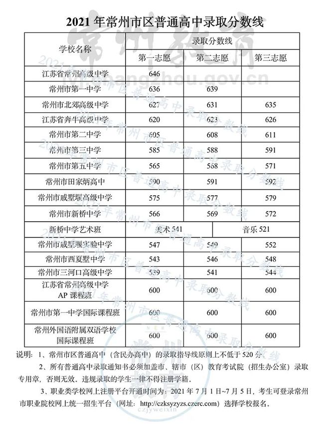 2021常州市普通高中招生录取分数线公布,具体如下: