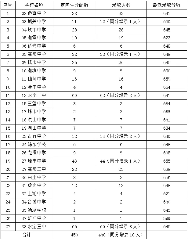 2021年永定一中定向生分校录取情况(分校计划总数:450人)