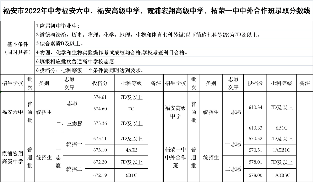 福安六中、福安高级中学、霞浦宏翔高级中学、柘荣一中中外合作班录取分数线