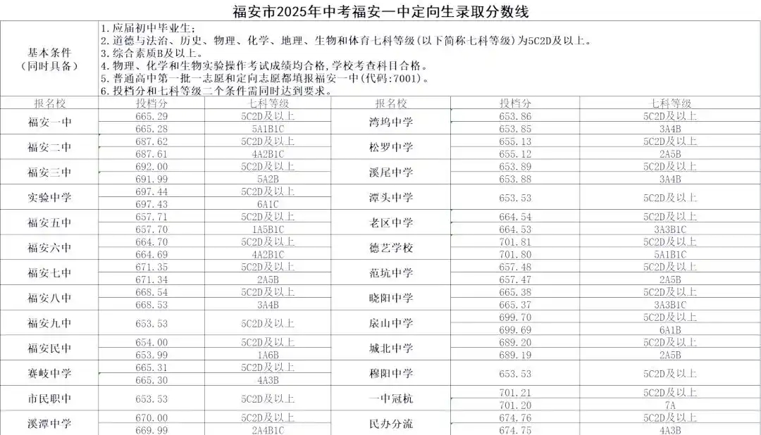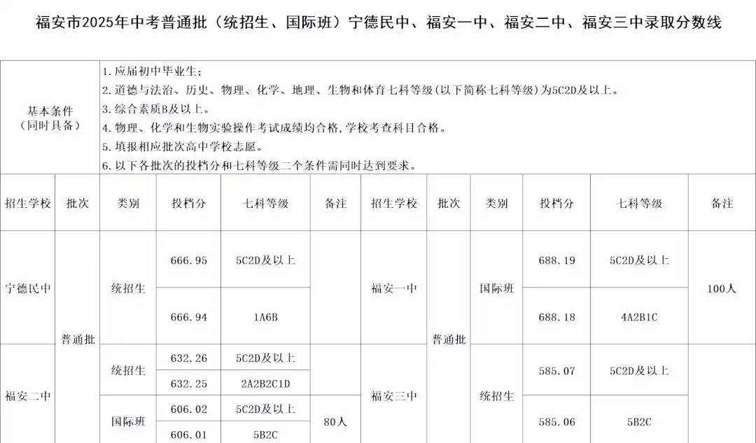 普通批(统招生、国际班)各校录取分数线详情如下:福安市2025年中考普通批(统招生、国际班)各校录取分数线一览