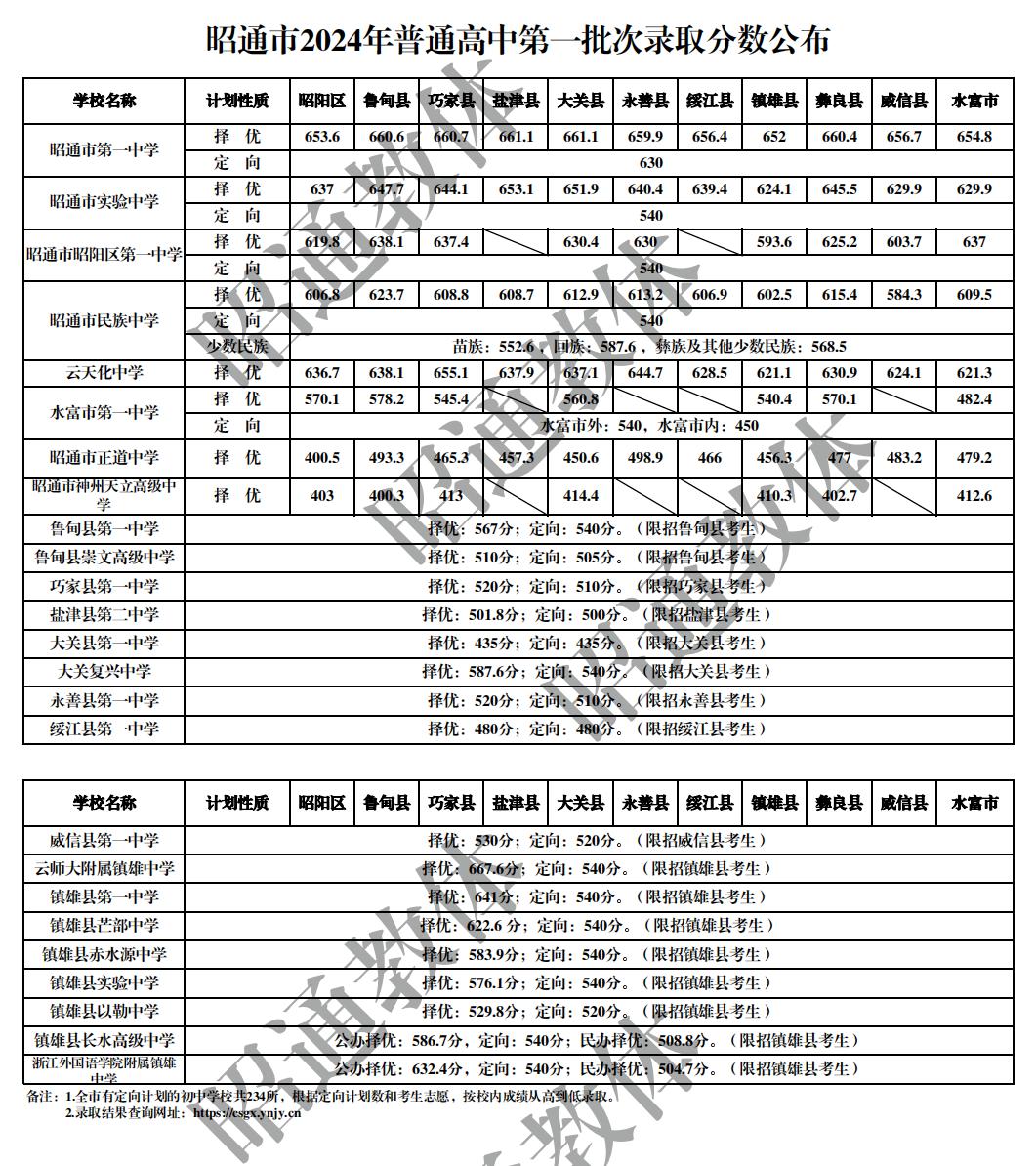 2024年昭通市高中招生录取分数线公布,具体如下: