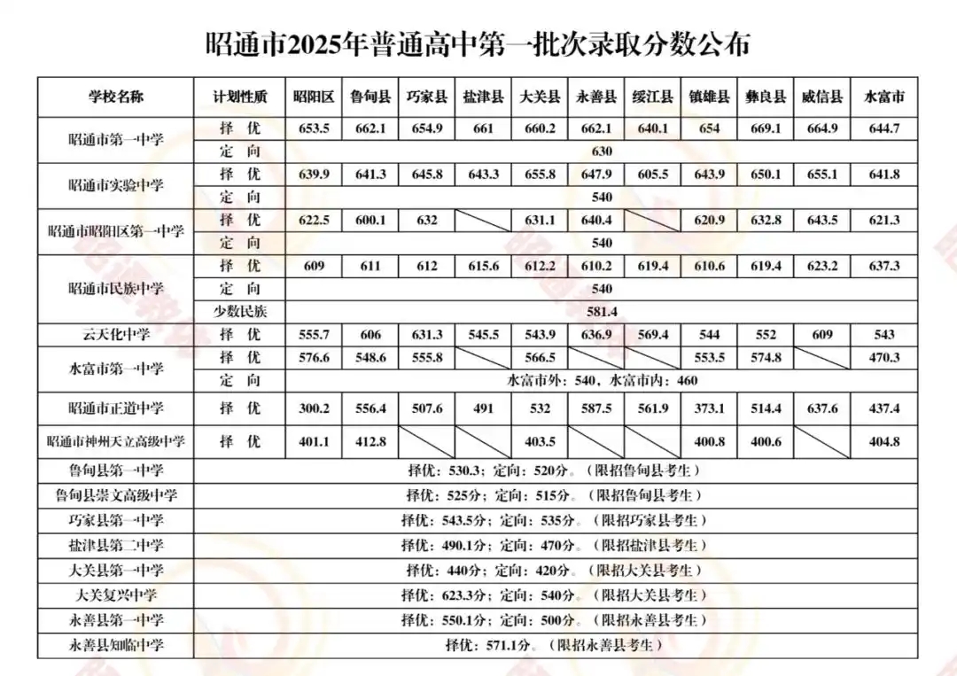 2025年昭通市高中招生录取分数线公布,具体如下: