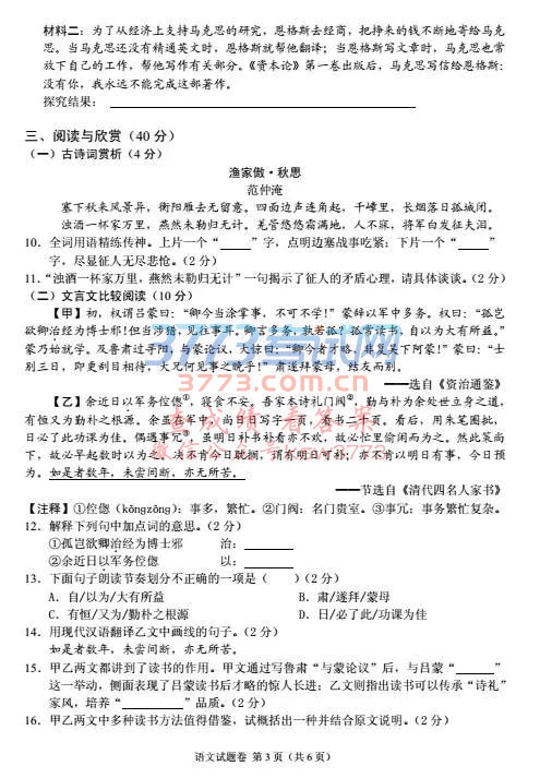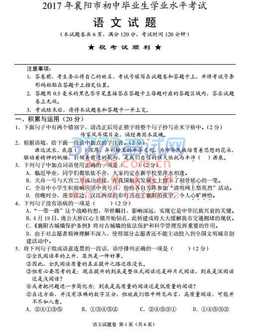 2017襄阳中考语文试卷试题及答案