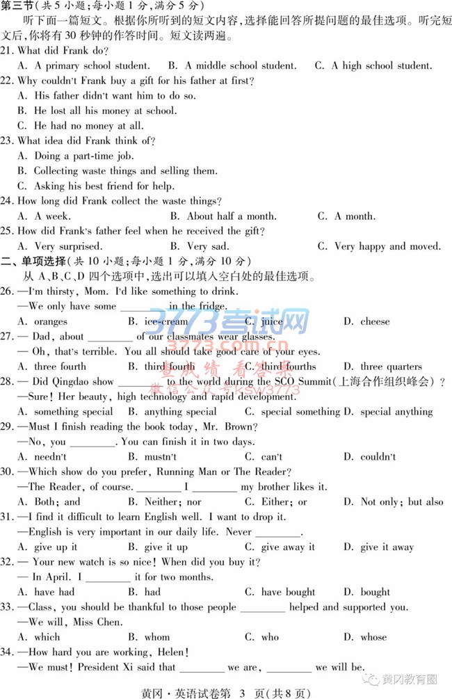 精英中考网消息:2018年黄冈中考结束,小编第一时间收集整理了2018黄冈中考英语试卷试题及答案,供广大考生参考!