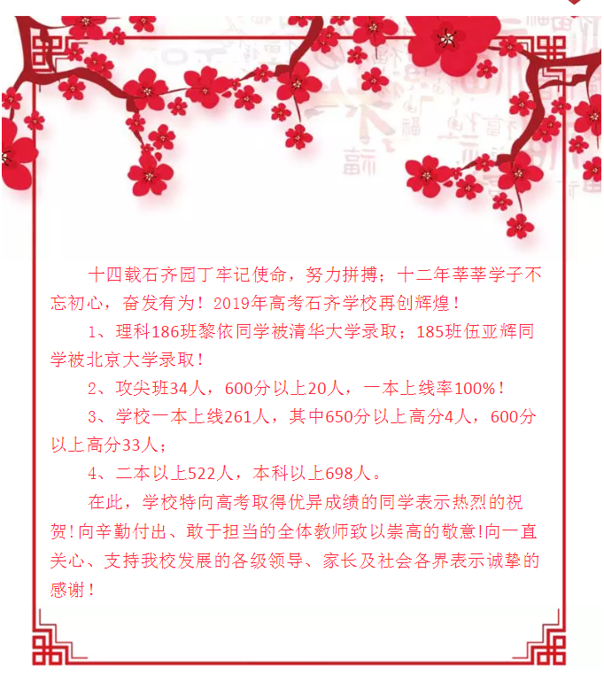 邵阳县石齐学校2019高考成绩喜报、一本二本上线人数情况