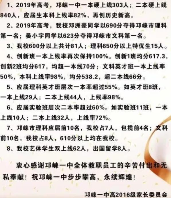 邛崃一中2019高考喜报成绩、一本二本上线人数情况