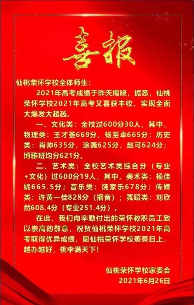 2021仙桃荣怀学校高考喜报成绩、本科一本上线人数情况