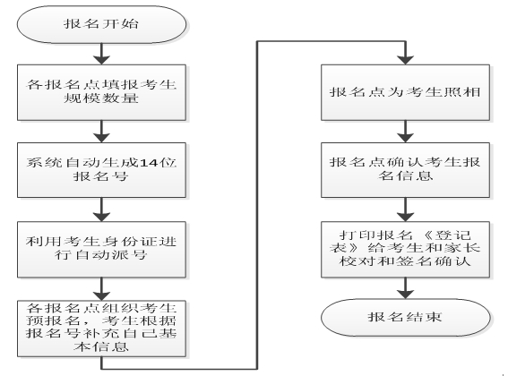 考生在报名过程中,身份证一经扫描录入系统,系统将自动派发一个报名号与考生,并自动导入个人身份信息,具体报名流程如下: