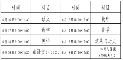 语文、数学、英语、物理、化学、道德与法治、历史、 藏语文、体育9科。各科总分 950分。其中藏语文(满分为150分,A卷100分;B卷50分)分两种试卷类型,藏语文(一)考察内容为藏语文(1-9年级),藏语文(二)考察内容为藏语文(1-6年级),其它科目试卷与普通类试卷一致。