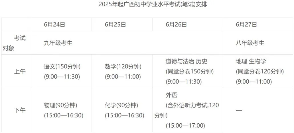 根据“学完即考”原则,地理、生物学科目考试将安排在八年级第二学期进行;道德与法治、语文、数学、外语、历史、物理、化学等7个科目则在九年级第二学期考试。